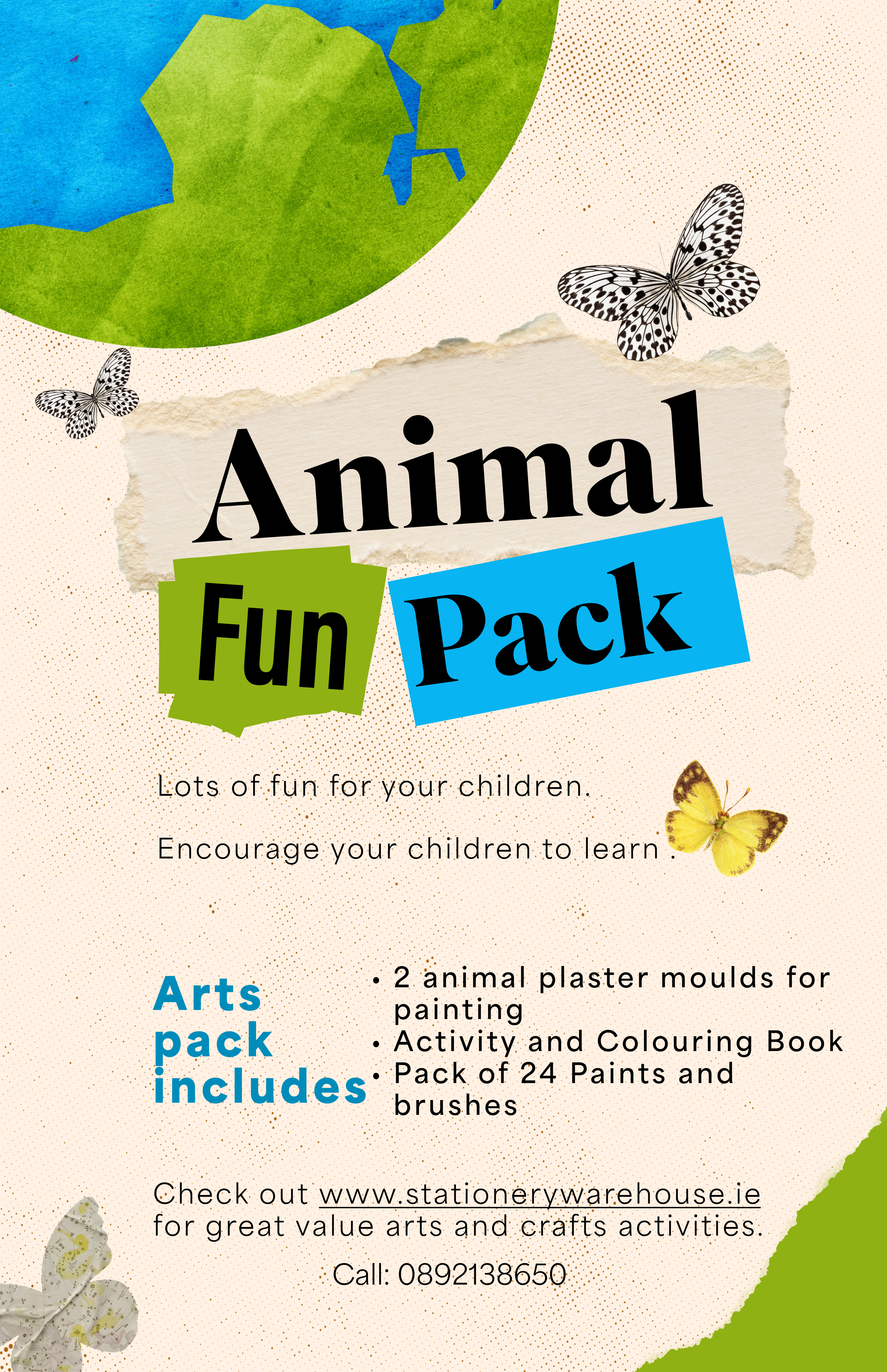 Activity pack Includes animal plaster moulds for painting, pack of 28 different coloured paints with brushes a colouring book Crayola activity colouring book and animal stickers.