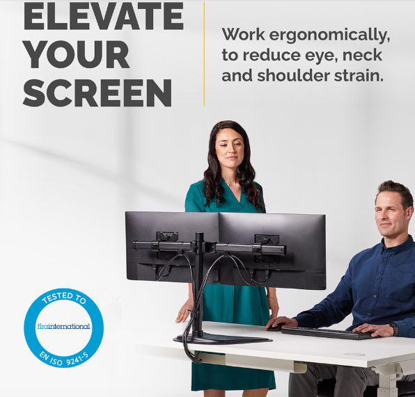 Fellowes Dual Monitor Arm Seasa Freestanding Monitor Mount for 8KG 27 inch Screens Ergonomic Adjustable Monitor Arm. Sitting or standing with bad posture all day using a computer is bad for your health. Leaning forwards or tilting your head up or down not only causes back and neck strain but is also bad for your eyes. The Fellowes Seasa dual monitor mount will improve your ergonomic posture and reduce back neck and eye strain. Dual screen working means you can view more screen content and can use multiple programs simultaneously. With ever shrinking office spaces, using a dual monitor stand means you can free up valuable work space to become more organised and productive. With effortless adjustment you can collaborate and share information with colleagues easily, making them perfect for hot desks or shared desks. The Fellowes double monitor stand is ideal for any workspace, with its stylish, convenient design. This fully independent adjustable dual monitor arm by Fellowes can pan 120°, tilt +/-45° and can rotate 360° for optimum viewing control. Intuitive cable management system and low profile base helps you minimise clutter with the Fellowes Seasa dual monitor arm. It’s free standing ability enables dual monitors to be used in spaces that do not allow a clamp or grommet mount – each arm can hold up to 8KG monitors with a maximum screen size of 27in/68.58cm and meets VESA monitor bracket standards. This dual monitor arm has been tested by FIRA International Ltd to comply with the ergonomic requirements set out in European Health and Safety Legislation: EN ISO 9241-5. The Seasa monitor arm comes with a 5 year warranty and access to top quality customer service to help with any queries you may have.