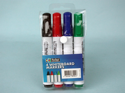 Packet of 4 Whiteboard markers. School and college approved, Easy to wipe off, dries in seconds.